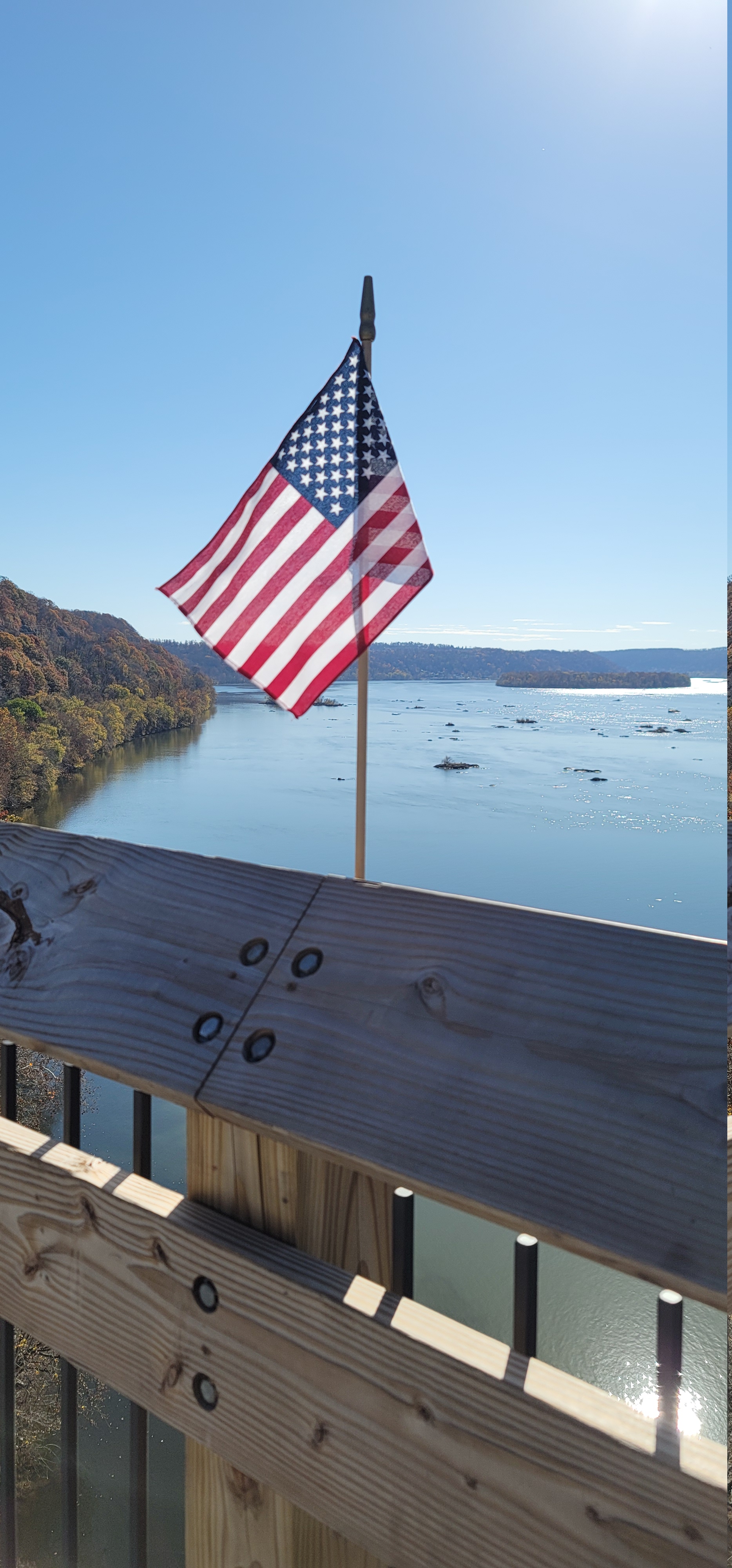 While I am not One of those people that’s all about patriotism all the time and waving flags for everything, I always think it’s great to see flags. They had them on the bridge and I really liked the way the sun was shining from behind and back lightning this one with the river and river hills in the background.